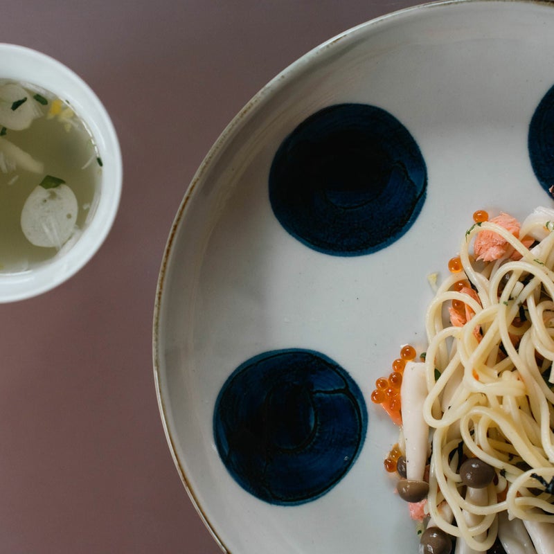 グレー味を帯びた白に藍色の絵付けが映えるいろはシリーズは、半磁器と呼ばれる、陶器と磁器の性質を併せ持っています。