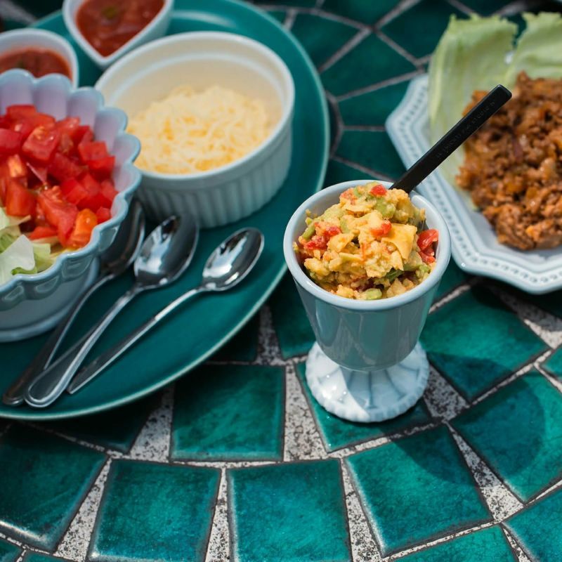 トルティーヤ:パレット 290プレート(スモーキーパープル) / タコスミート:ヴェルナーレ 6プレート / レタス・トマト:ヴェルナーレ 5コンポート / ワカモレ:ヴェルナーレ プチカップ / サルサソース・チーズ:スタッフ私物 / アンダープレート:パレット 290プレート(トルコグリーン) / 取り皿:パレット 195プレート(白・スモーキーパープル)