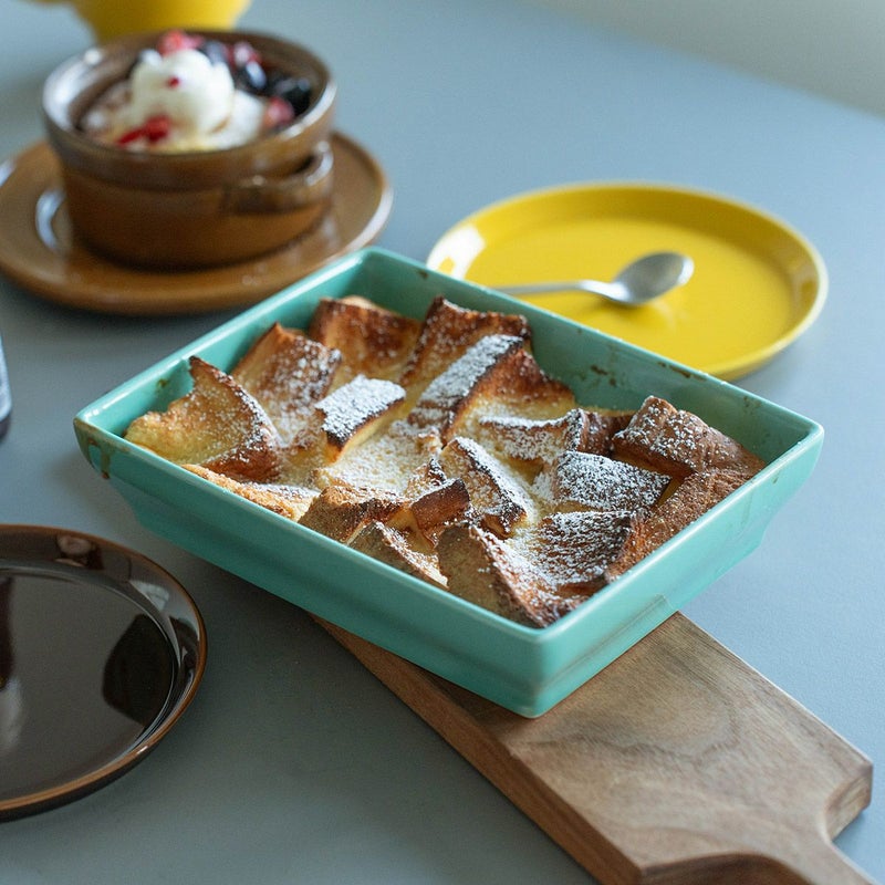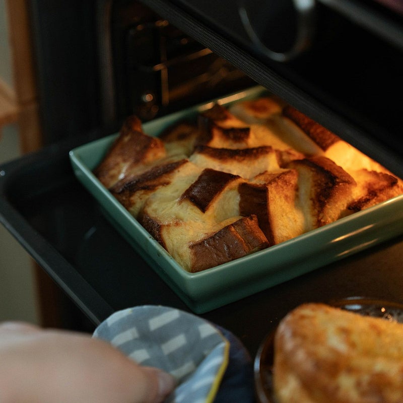 オーブンウェアにしては珍しい長方形ですが、トースターやオーブンに入れやすく、食器棚への収まりもいいのです。