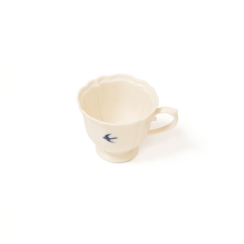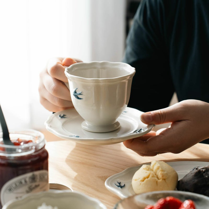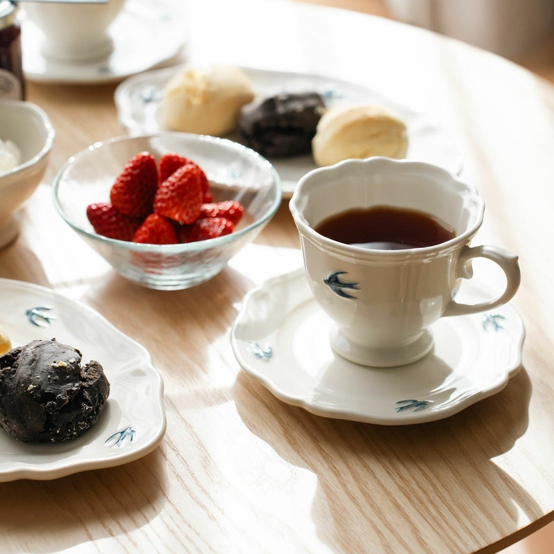 やわらかなアイボリーがかった白磁に、飛び立つツバメのワンポイントが映え、食卓に優雅な雰囲気を添えてくれます。