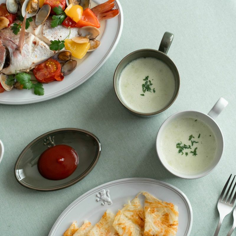 アクアパッツァ・ブスルケッタ:マルタ 280オーバルプレート(オリーブ・ブラン) /じゃがいものガレット・グレフルとパプリカのマリネ:マルタ 230オーバルプレート(オリーブ・ブラン) / カプレーゼ・ケチャップ:マルタ 130オーバルプレート(オリーブ・ブラン) / 枝豆のポタージュ:マルタ マグカップ(オリーブ・ブラン)