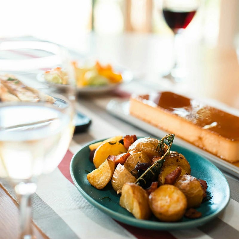 じゃがいもとベーコンのローズマリーソテー:パレット 195プレート(トルコグリーン) / プリン:アソルティL(白)