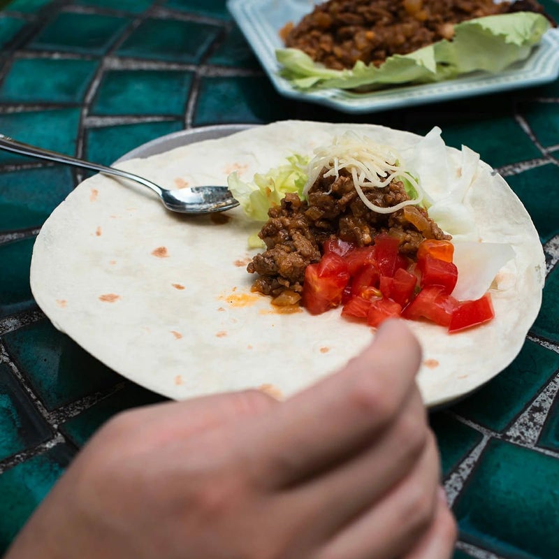 トルティーヤ:パレット 290プレート(スモーキーパープル) / タコスミート:ヴェルナーレ 6プレート / レタス・トマト:ヴェルナーレ 5コンポート / ワカモレ:ヴェルナーレ プチカップ / サルサソース・チーズ:スタッフ私物 / アンダープレート:パレット 290プレート(トルコグリーン) / 取り皿:パレット 195プレート(白・スモーキーパープル)