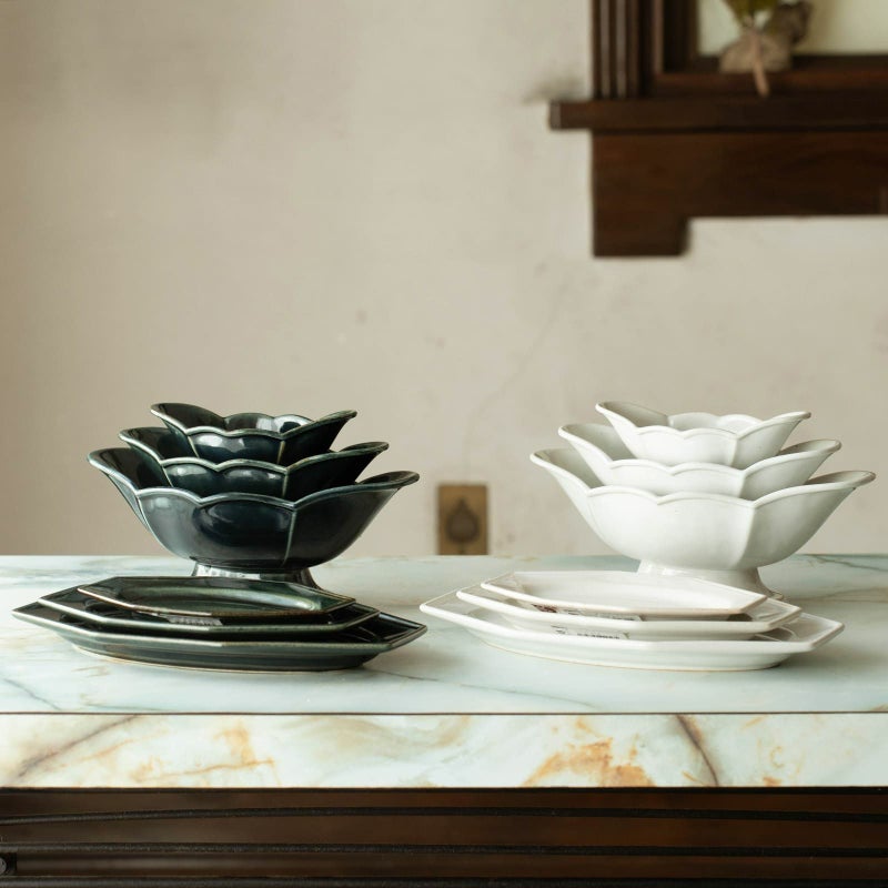 八角形に施された控えめなエッジと、白や濃藍の味わい深い色合いが、和の器としての魅力を見せてくれます。